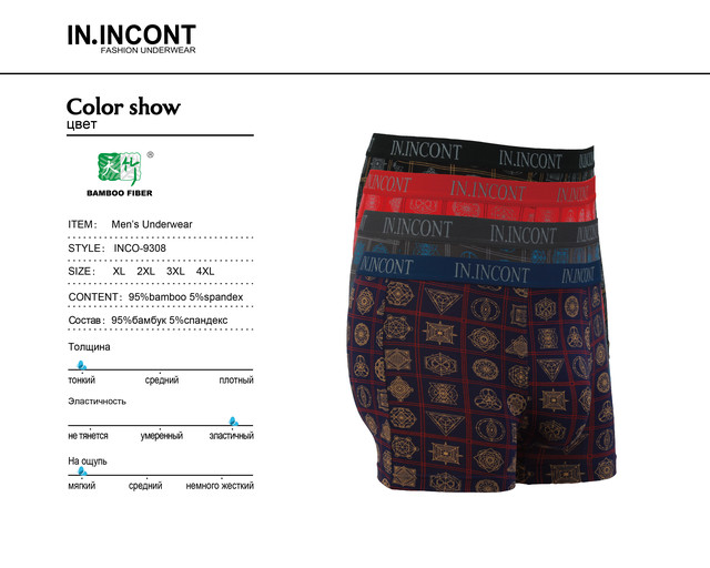 Бамбукове волокно має антибактеріальні властивості, допомагає підтримувати свіжість і комфорт навіть у спеку. Спандекс додає тканині еластичності та стійкості до розтягування, тому боксери не деформуються після численних прань. Матеріал середньої щільності, гладкий і приємний на дотик. Яскравий принт і фірмовий пояс із логотипом INCONT надають моделі впізнаваного стилю.