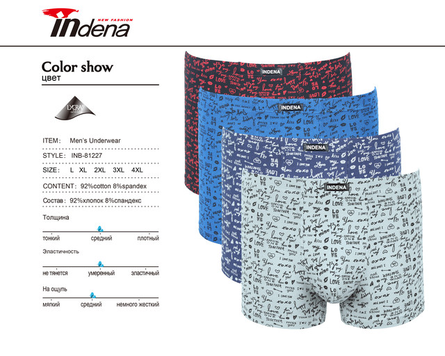 Дані чоловічі боксери від торгової марки «Індена» пошиті із комбінованої трикотажної тканини. Вона стрейчева, дуже еластична та стійка до зношування, як будь-яка синтетика. Ось тільки синтетичних волокон у складі матеріалу пошиття лише 5% (і це спандекс). Інші 95% є звичайною натуральною бавовною. Тому труси мають всі переваги, які характерні для бавовняних речей. А саме, вони: