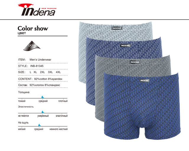 Дизайн боксерів виконаний із дрібним абстрактним принтом з тонких ліній, що надає білизні оригінального вигляду та сучасного характеру. Відтінки синього та сірого підкреслюють стриманість і універсальність моделі, роблячи її придатною для будь-якого гардероба. Дизайном передбачена скрита гумка середньої ширини з пришивною лейбою з логотипом Indena, що додає впізнаваності та відчуття якості.
